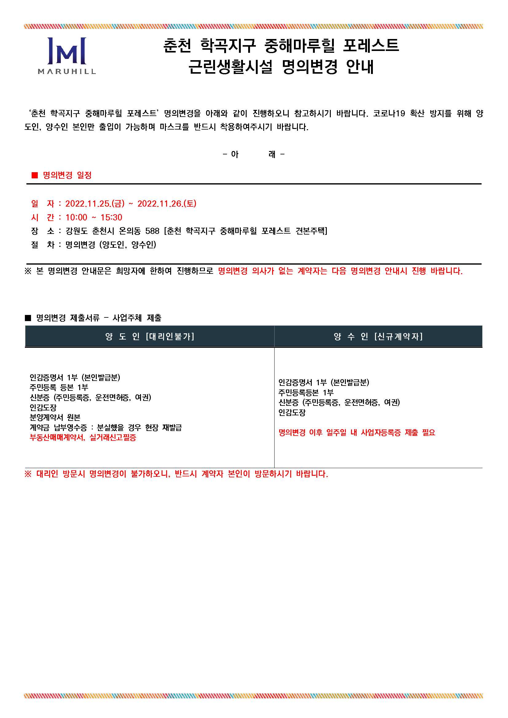 공지사항마루힐소식마루힐앨범자료실사전조사명의변경입주예약 [춘천학곡지구 중해마루힐] 근린생활시설 명의변경 안내문 페이지 정보 조회 1,393회 작성일 22-11-10 14:14 본문 [춘천학곡지구 중해마루힐] 근린생활시설 명의변경 안내문 목록 이전글[춘천학곡지구 중해마루힐] 아파트 명의변경 안내문 / 시스템에어컨 변경 안내문 22.11.10 다음글[첨단2차 중해마루힐] 명의변경 안내문 22.07.04
