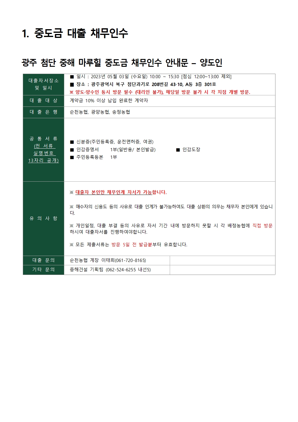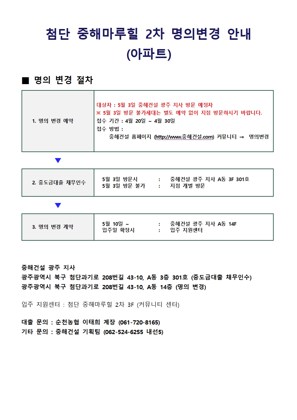 공지사항마루힐소식마루힐앨범자료실사전조사명의변경입주예약 [첨단 중해마루힐 2차] 명의변경 안내 페이지 정보 조회 1,400회 작성일 23-04-18 10:43 본문 명의변경 안내 목록 이전글[첨단 중해마루힐 2차] 근린생활시설 입주안내문 23.05.03 다음글[첨단 중해마루힐] 실내공기질 측정 보고서 23.04.13