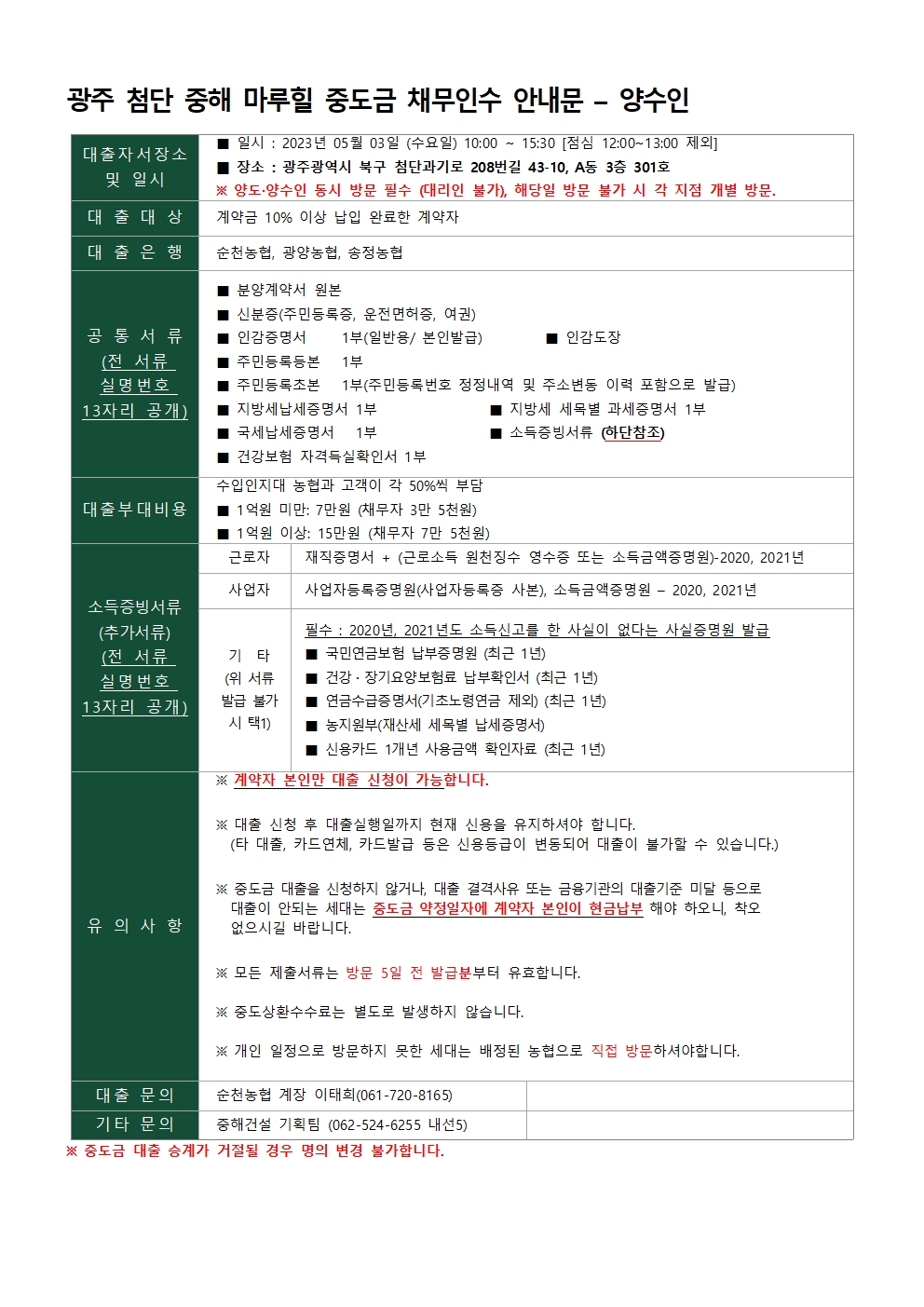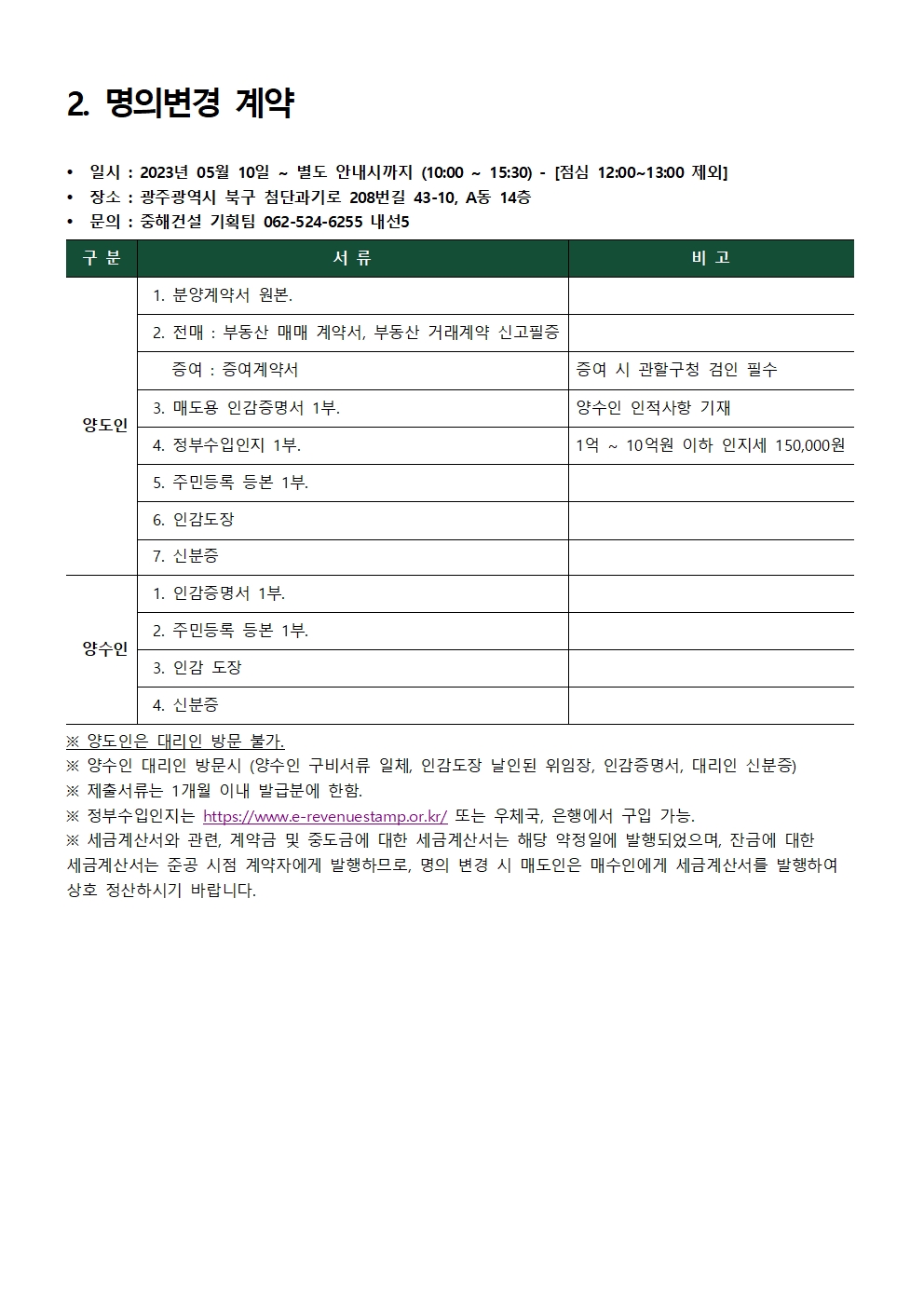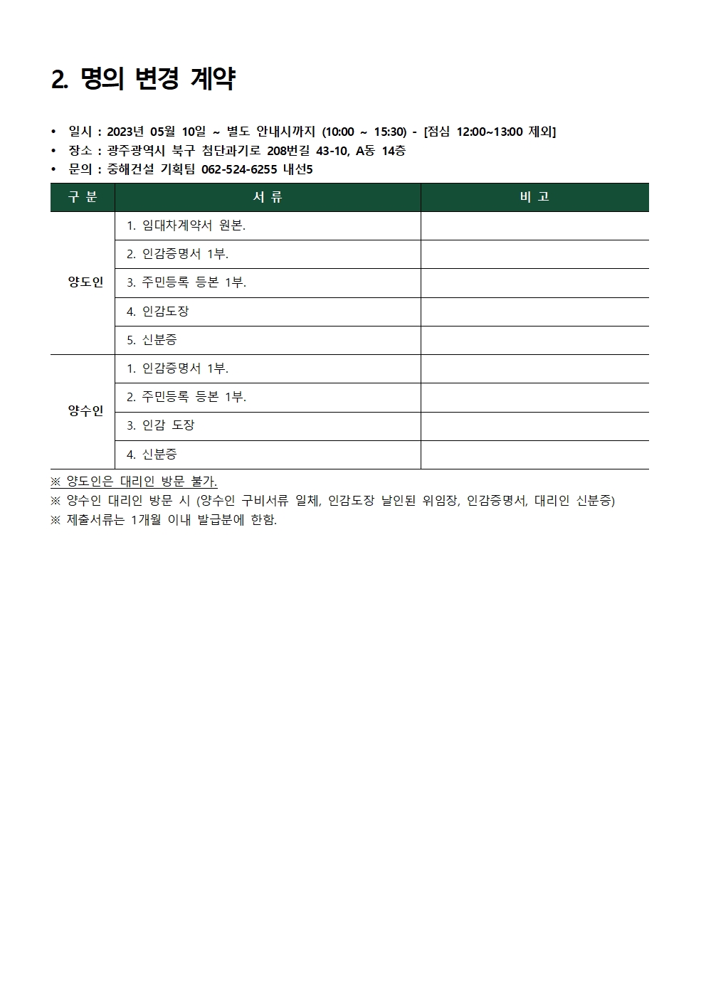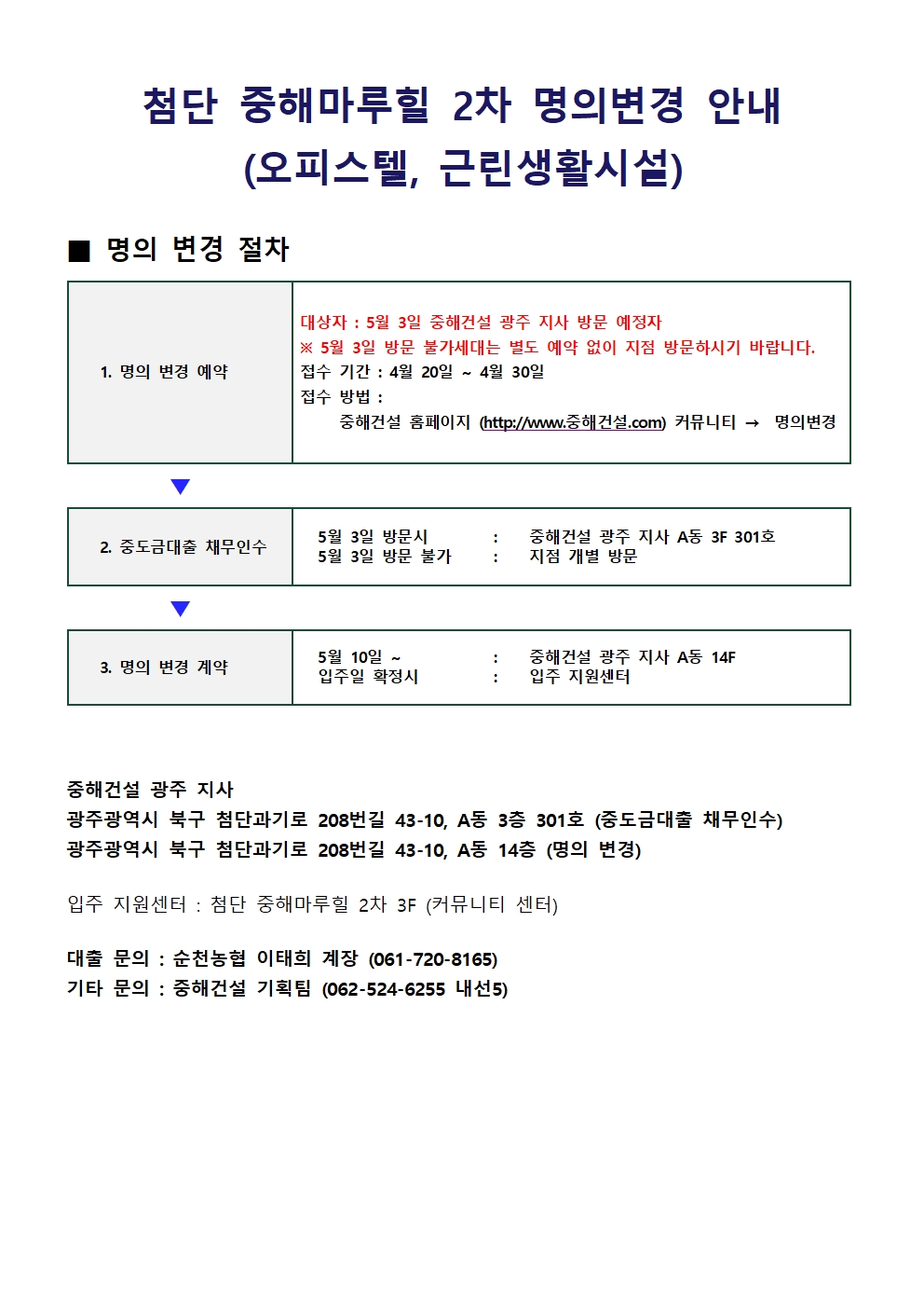 공지사항마루힐소식마루힐앨범자료실사전조사명의변경입주예약 [첨단 중해마루힐 2차] 명의변경 안내 페이지 정보 조회 1,400회 작성일 23-04-18 10:43 본문 명의변경 안내 목록 이전글[첨단 중해마루힐 2차] 근린생활시설 입주안내문 23.05.03 다음글[첨단 중해마루힐] 실내공기질 측정 보고서 23.04.13